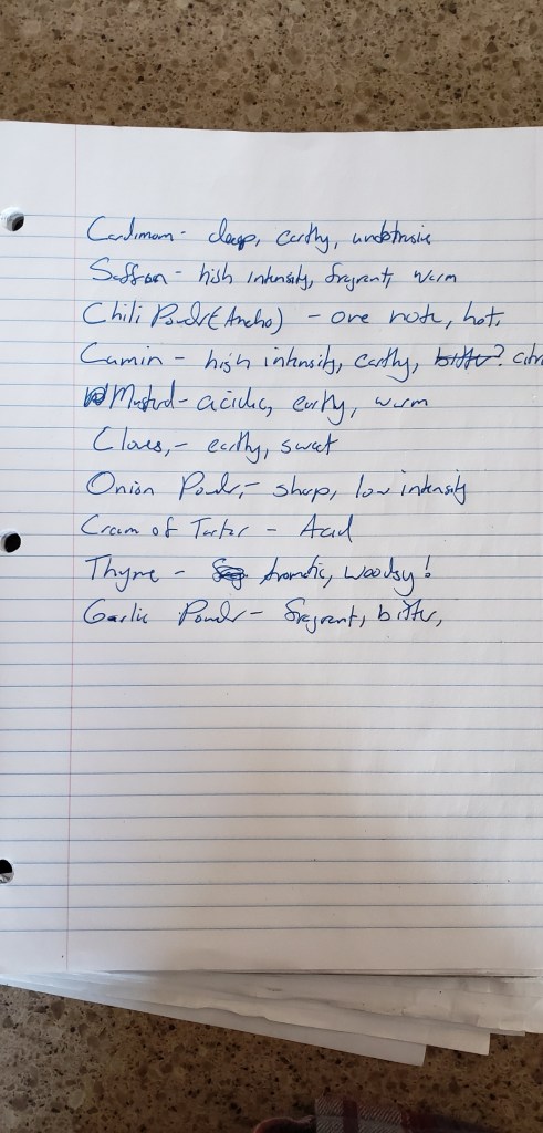 To test my knowledge of the spices in my kitchen I wrote down my impressions of each spice in my spice drawer: