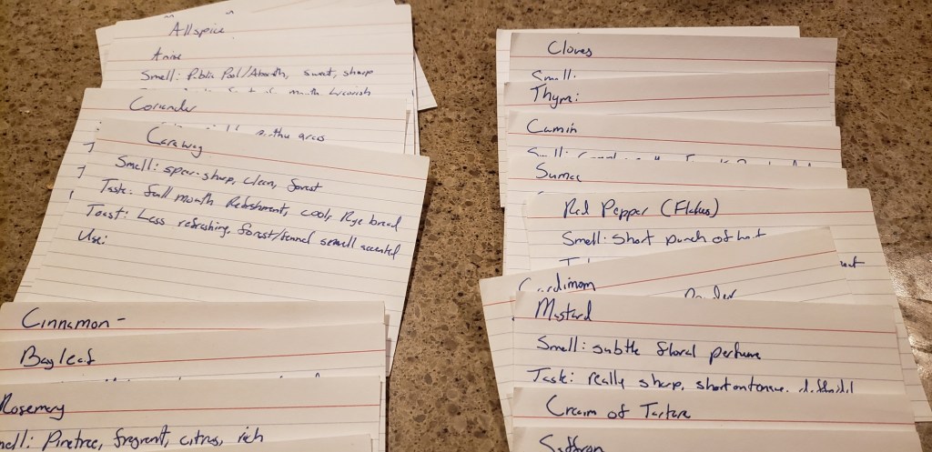 I ended with a series of notecards (pictured below) that captured a much more accurate and personal description of the spice. During the tasting, I found that I was able to describe, with much more precision, flavors and smells that I was confident I knew prior.